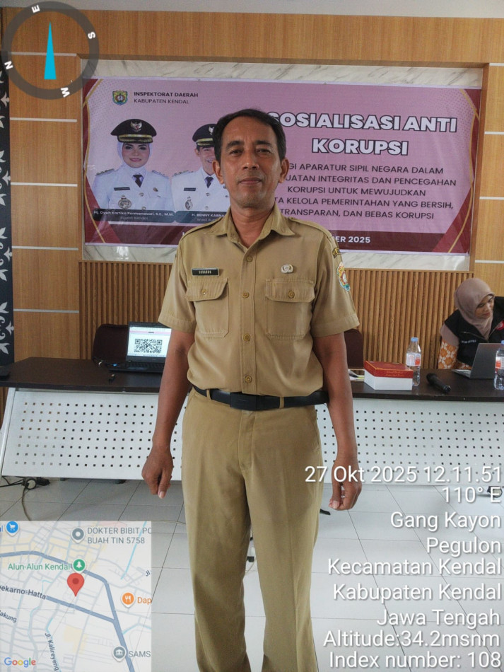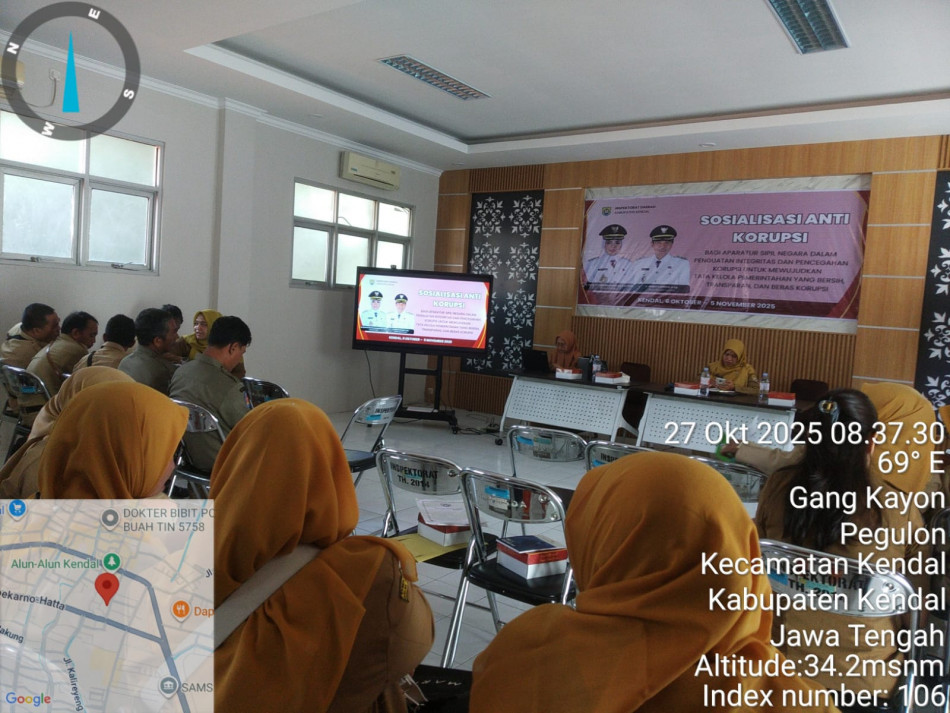 Senin, 27 Oktober 2025 dilaksanakan Sosialisasi Pesan/ Nilai-Nilai Anti Korupsi Tahun 2025, bertempat di aula lantai 2 Gedung Inspektorat Kabupaten Kendal dan diikuti oleh seluruh ASN se Kecamatan Kendal.