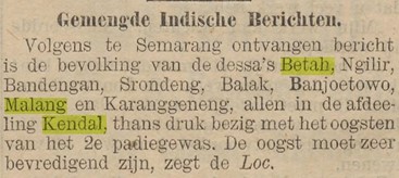 Volgens te Semarang ontvangen bericht is de bevolking van de dessa's Betah, Ngilir, Bandengan, Srondeng, Balak, Banjoetowo, Malang en Karanggeneng, allen in de afdeeling Kendal, thans druk bozig met het oogsten van het 2e padiegewas. De oogst moet zeer bevredigend zijn, zegt de Loc (Wybrands 1904, 6).