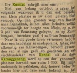 Niet van belang ontbloot is zeker het volgende waarvoor ik u dan ook beleefd, een klein plaatsje in uw alom gelezen blad verzoek. Op den grooten weg van Boeloe naar Djarakkah, is het alles behalve veilig, voornamelijk ter hoogte van Mlojo, op p. m. 3 paal van Semarang gelegen, en op Kambangan, tusschen paal 4 en 5 van Semarang.