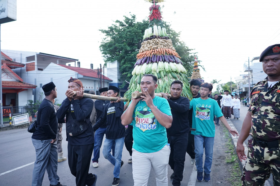 Mereka berjalan beriringan, mengawal gunungan dan tumpukan LEPET DAN ANEKA SAYURAN warna-warni—simbol utama dalam tradisi megengan yang telah mengakar kuat di tengah masyarakat.